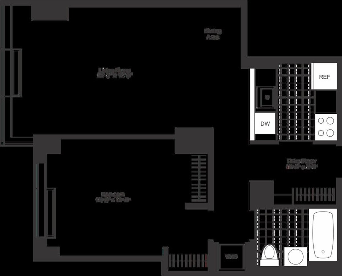 Corner 1 Bedroom, 1 Bath with an oversized private terrace, a pass-through kitchen, stainless steel appliances, an in-home washer/dryer, floor-to-ceiling windows, spacious closets, high ceilings, and southern exposure.